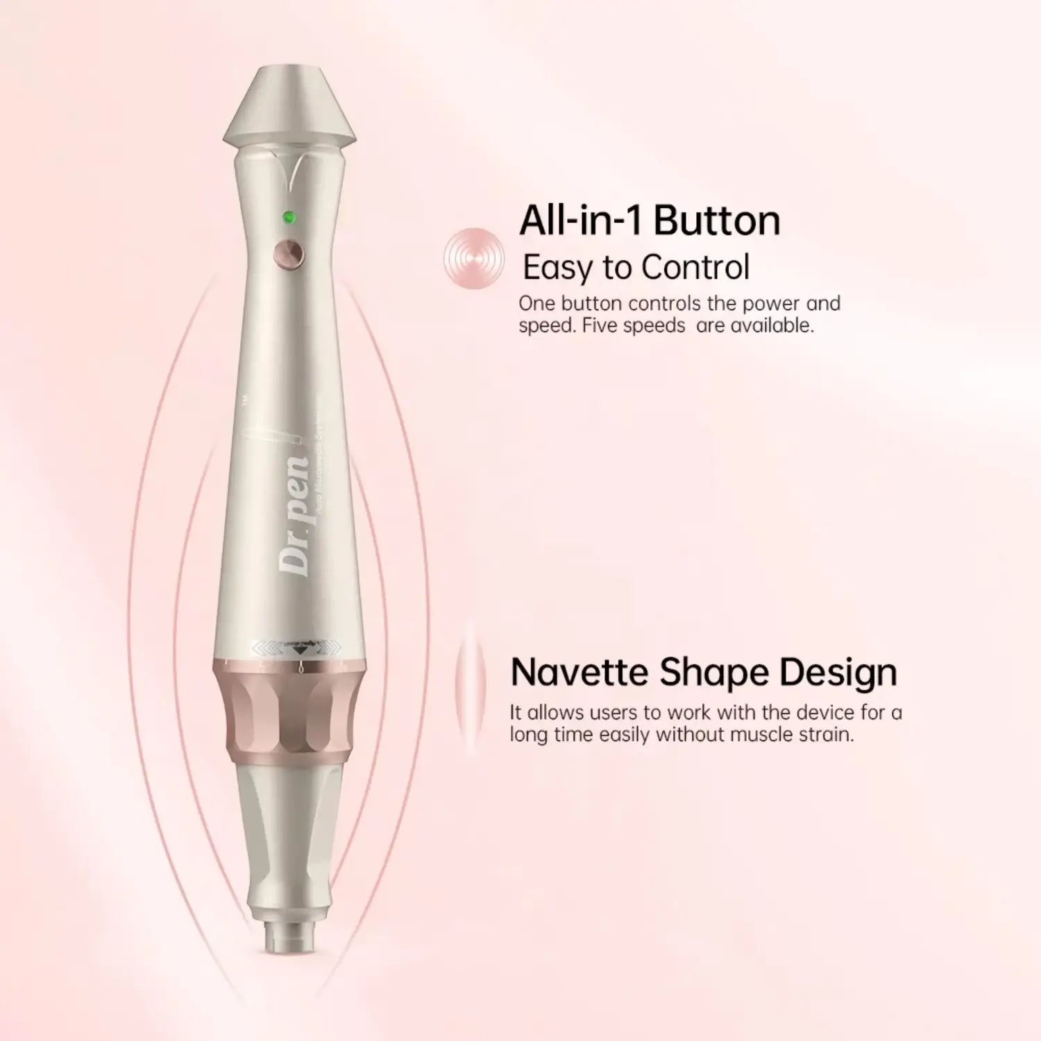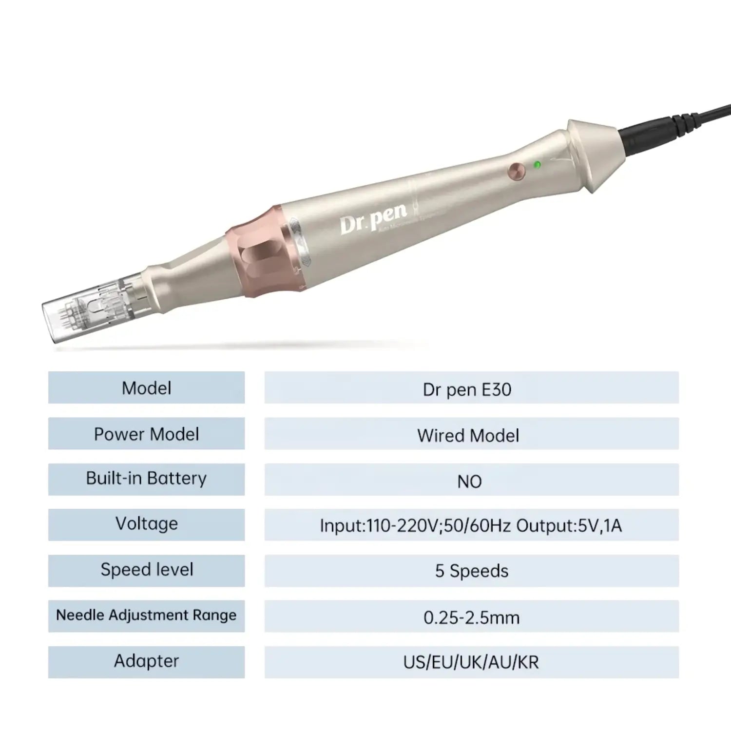 The Dr. Pen E30 is a wired cosmetic microneedling device designed to support smoother skin appearance and enhance the absorption of topical products. Featuring adjustable needle depth and five speed levels, this user-friendly tool is ideal for at-home beauty routines and professional use. Its ergonomic design ensures stability during application, while single-use cartridges help maintain a clean and hygienic experience.